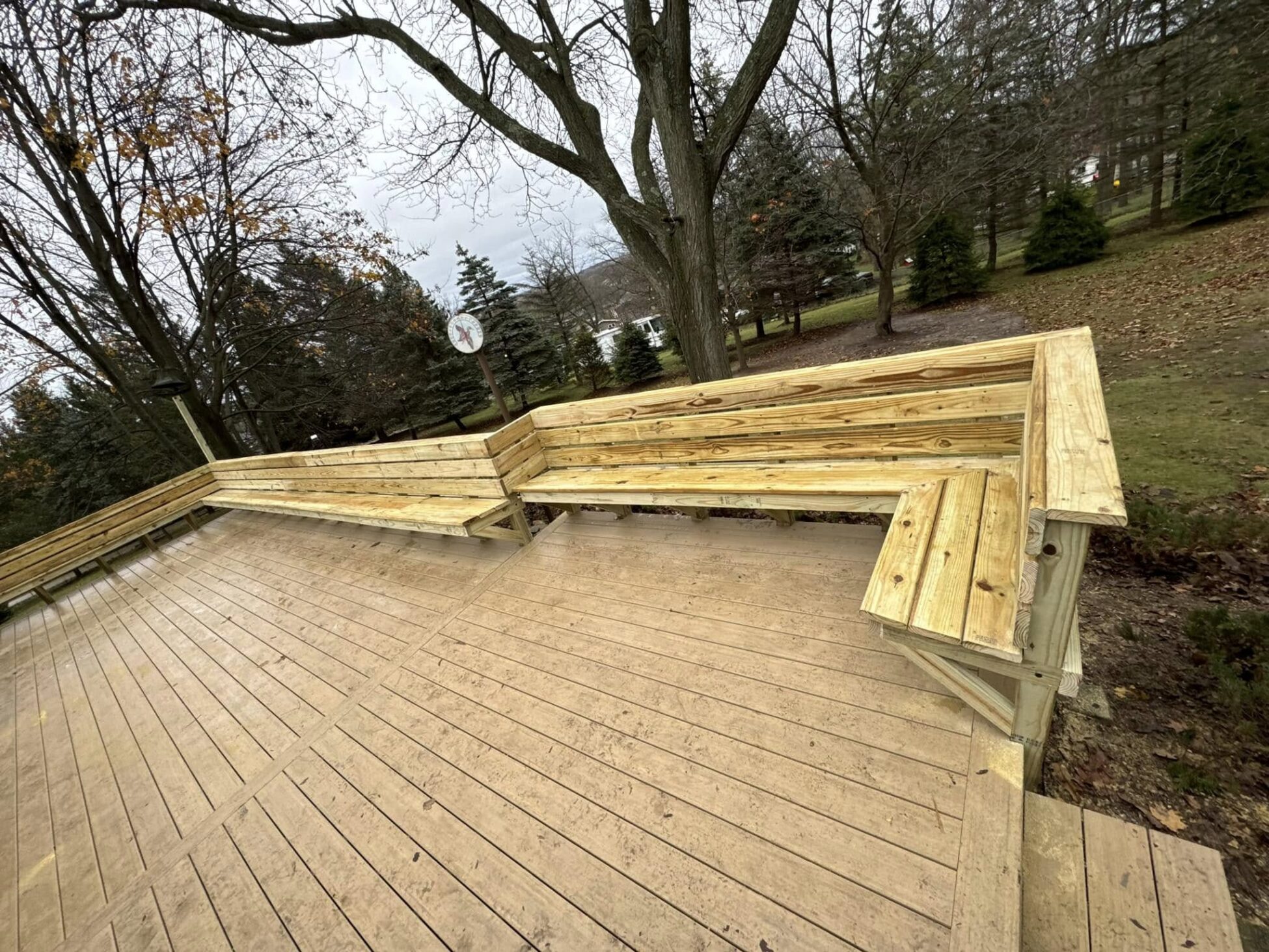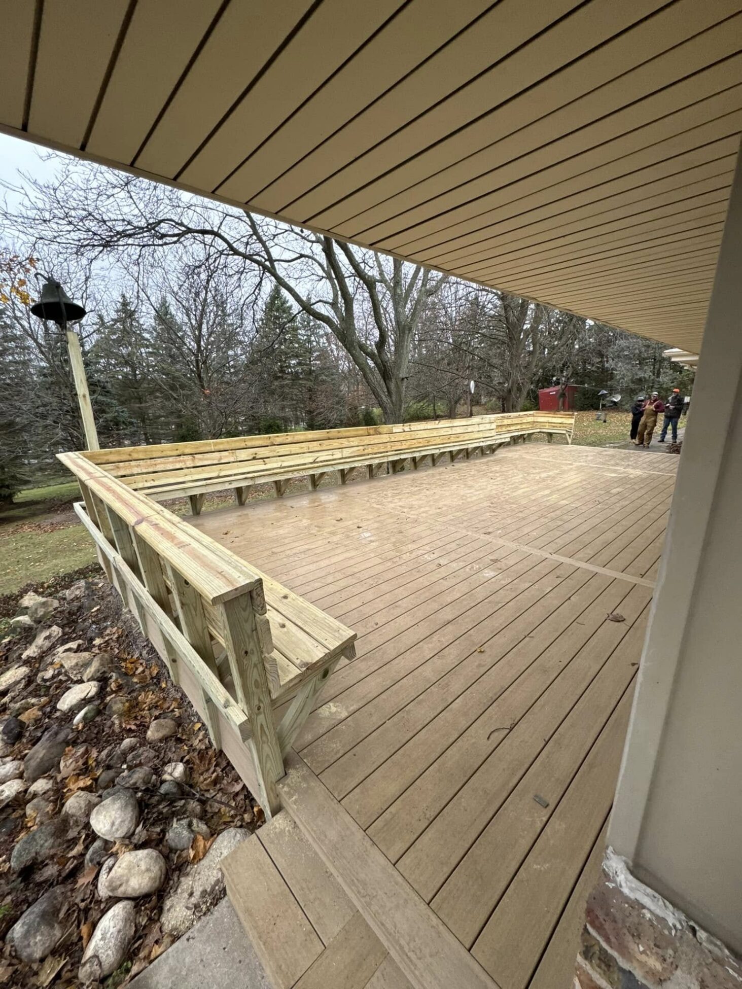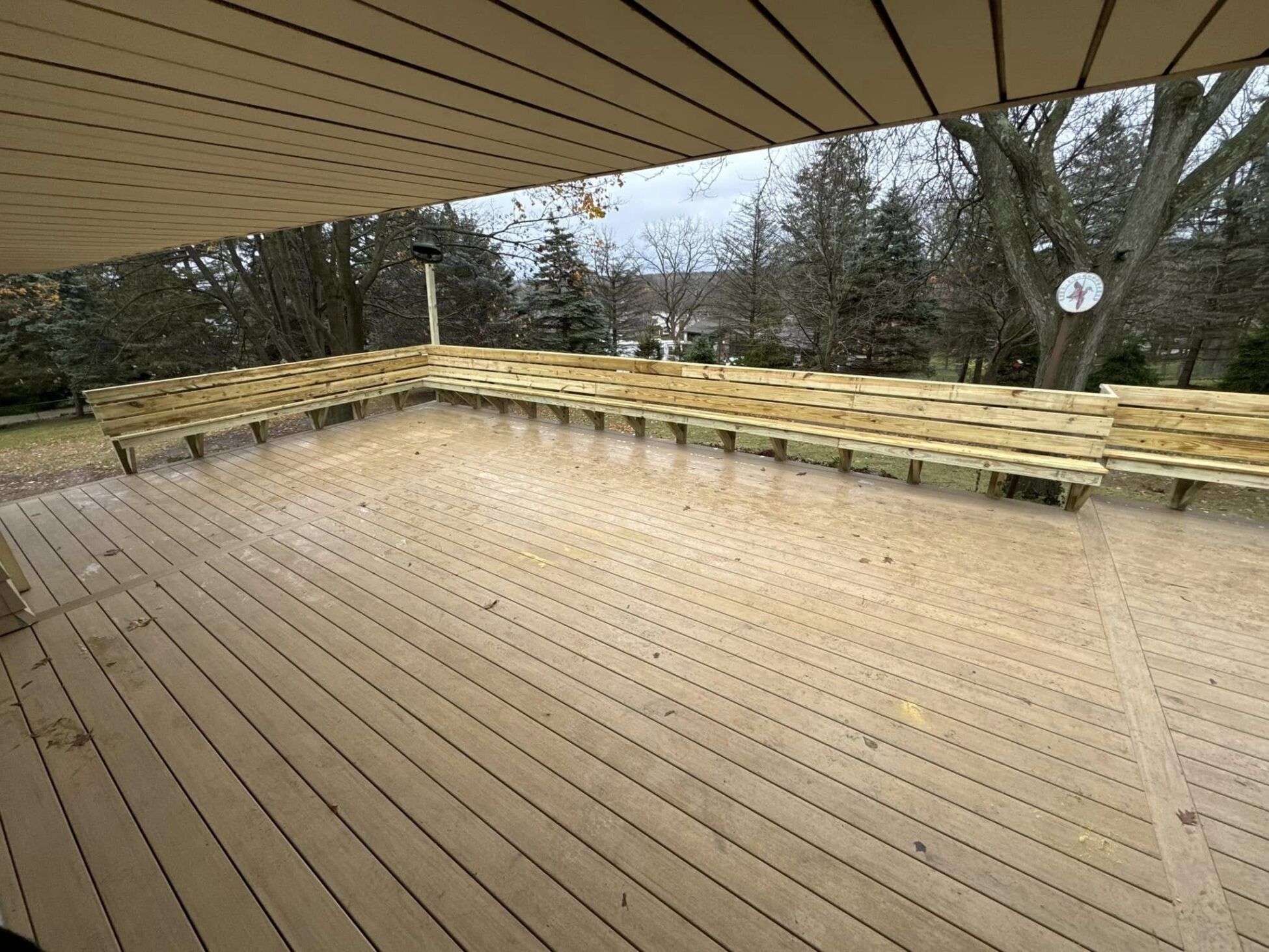 A standout feature of this project is the fully custom wood bench seating installed along the deck’s perimeter.