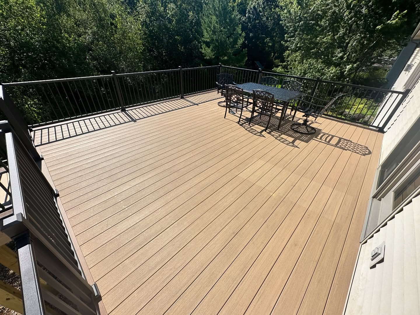 The new deck was built using TimberTech PVC decking in Weathered Teak and English Walnut tones, paired with JAM Advantage textured black aluminum railing. The finished space provides a clean, low-maintenance outdoor living area with wrap-around stairs for convenient backyard access.